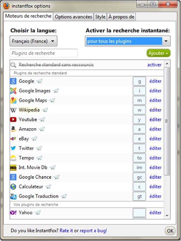 L’accès à la personnalisation se fait comme d’habitude depuis le menu Outil/Modules complémentaires puis vous sélectionnez les options du module InstantFox.