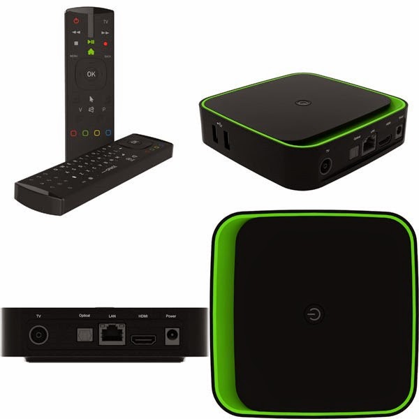 Il dévoile un boitier noir et vert assorti d’une télécommande gyroscopique, très douce au toucher (peau de pêche) et disposant d’un clavier QWERTY en plus des touches classiques (un rétro-éclairage aurait été bienvenu mais peut être au prix d’une trop faible autonomie) ainsi qu’un petit guide de mise en service et un câble min-USB qui permettra notamment de recharger la télécommande.